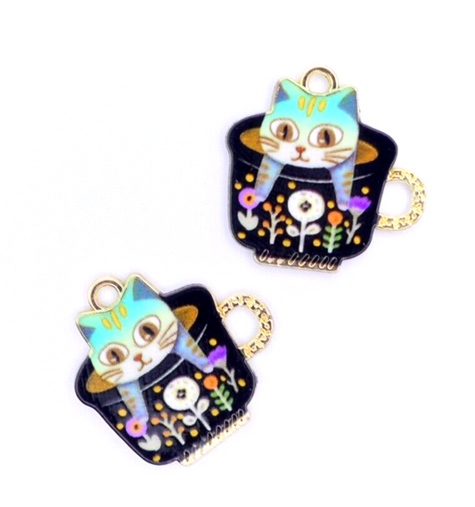 2 Cat In A Tea Cup Enamel Charms Kitten Pussycat Jewellery Making Crafts