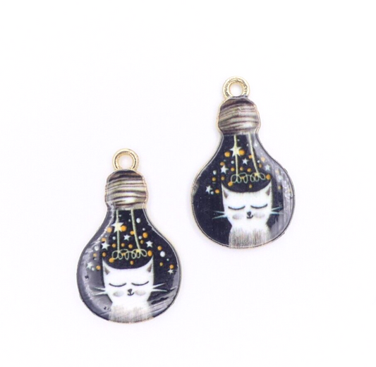 2 Cat In A Lightbulb Enamel Charms