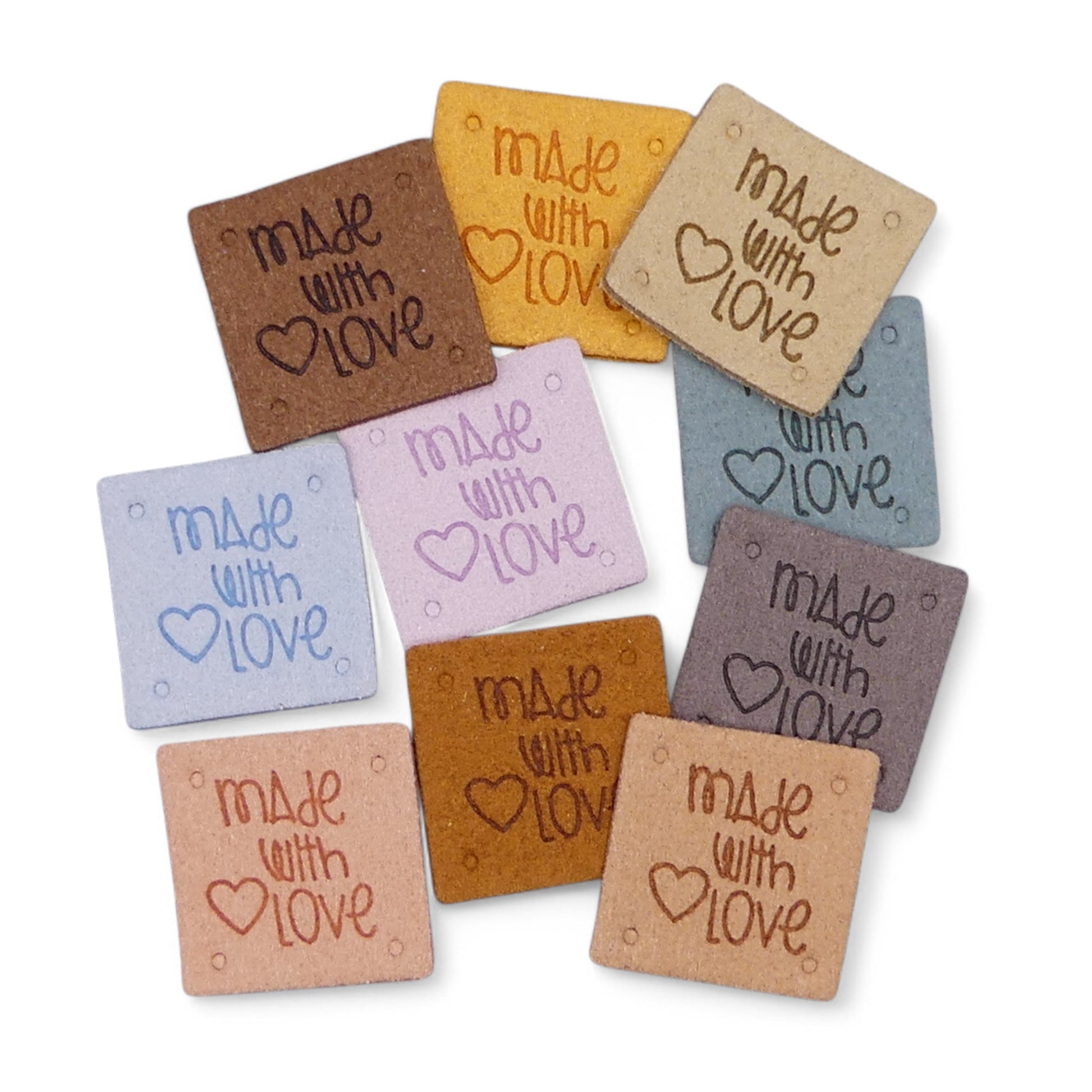 Add a special touch to your handmade creations with these 10 Square sew-on labels made from high-quality faux leather (PU leather). Each tag features an embossed "hand made with love " text with heart design, making them perfect for knitting, crochet, sewing, and other crafts.